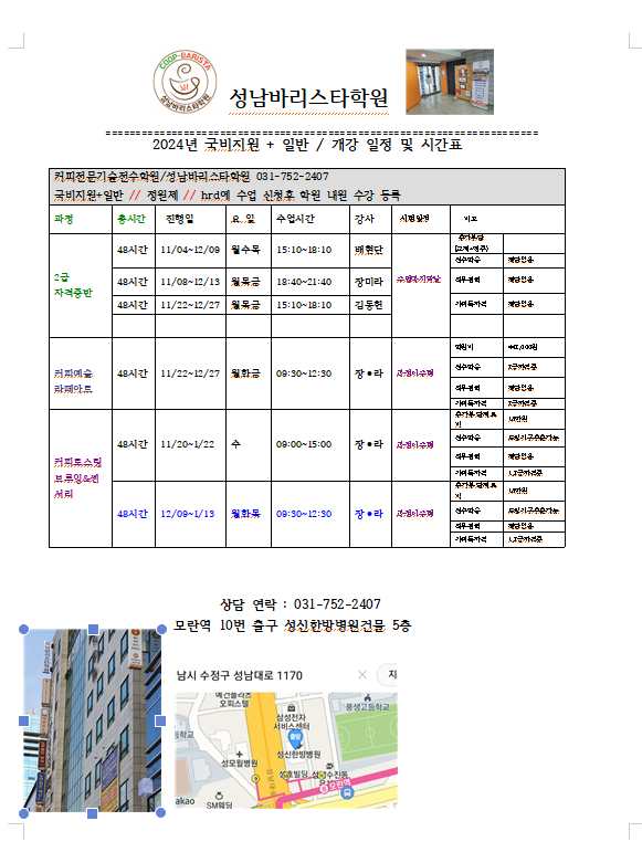 2024년11월 넷째주 성남바리스타협동조합.성남바리스타학원 개강일정표